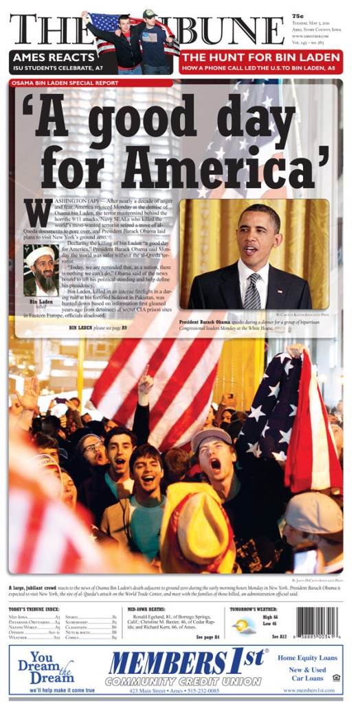 I had to leave the book festival a little early on Sunday to fly back to Ames. I caught at taxi about 2 p.m. and soon embarked on the long flight home, my new books in tow. It was late when we landed in Des Moines. As the wheels touched down, I of course turned on my BlackBerry to find out if I had missed anything. It just so happened that I had missed something big: the breaking news that Osama bin Laden had been killed. I had at least three e-mail alerts about it, which I shared with a few people sitting around me on the plane.