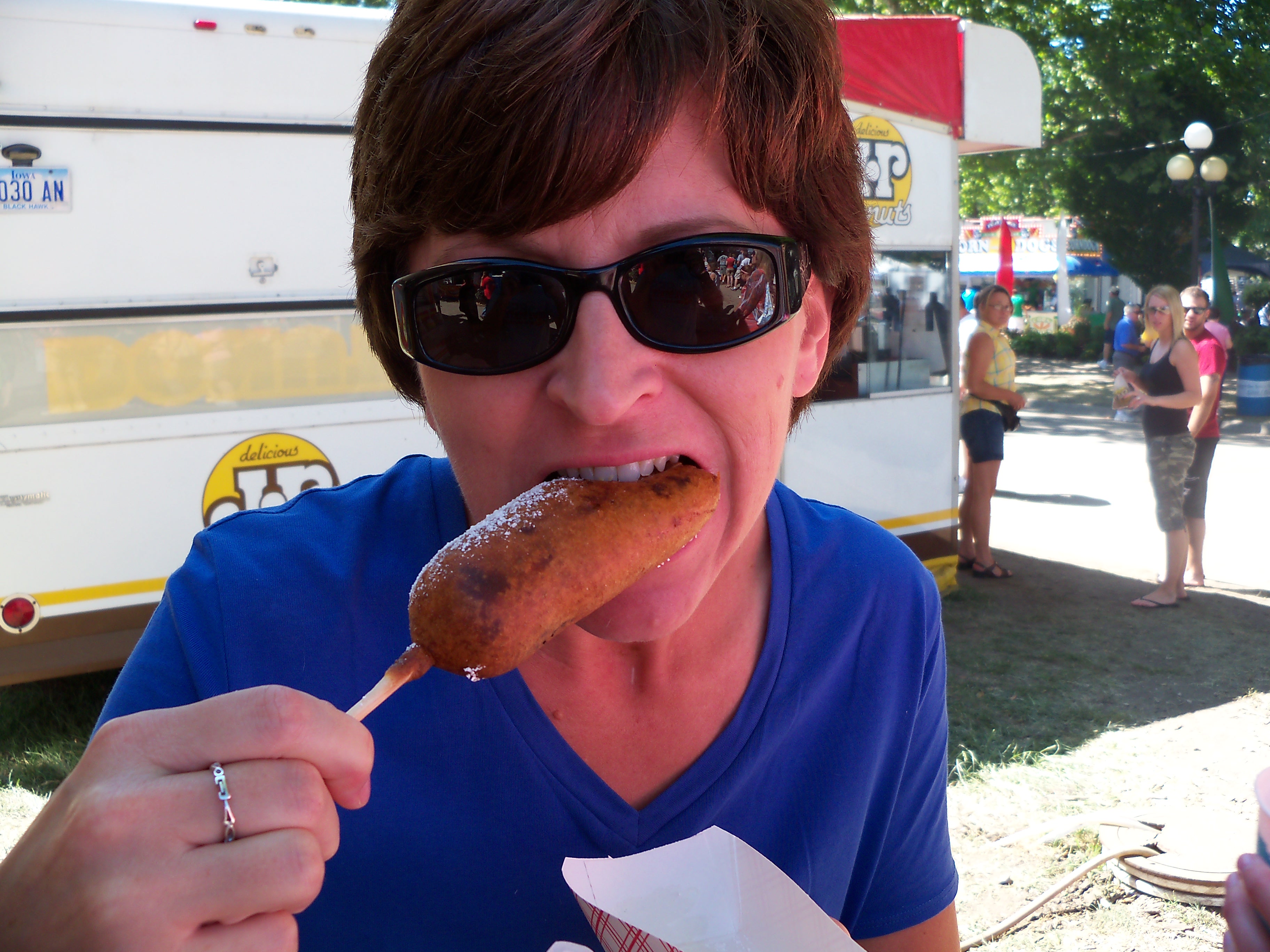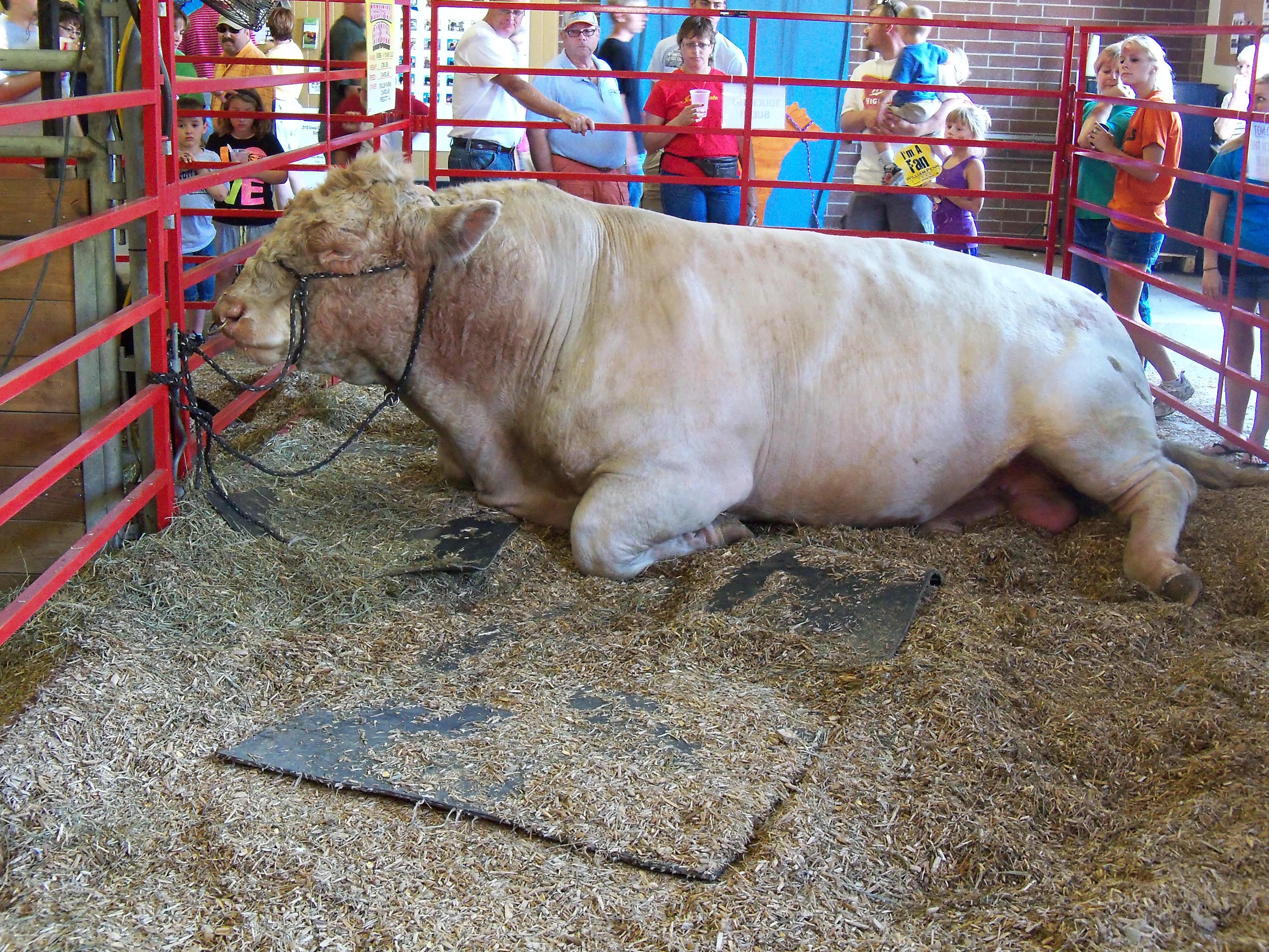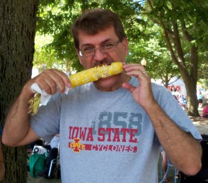 The next day, Tammy, Sara and I attended the Iowa State Fair in Des Moines. It was good weather and we had a lot of fun. We got the full flavor of the event, including seeing the biggest bull, biggest pig and biggest sheep. We also saw some really big and really small horses, and all kinds of frilly chickens. The standard fair fare. We didn’t go into the snake tent. We ate lots of stuff on sticks, including a deep-fried Snickers. We took a gander at the fair’s most famous attraction, the butter cow, and bought a butter cow Christmas ornament to honor the occasion.